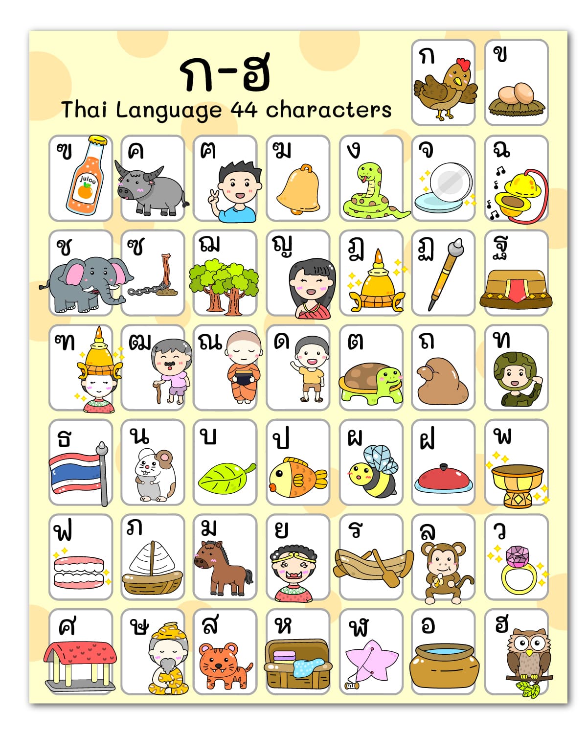 // พยัญชนะไทยมี 44 ตัว สระมี 21 ตัว — เยอะมาก และไม่ต้องแปลกใจถ้าผู้ใหญ่ไทยจะท่องไม่ได้ว่า พยัญชนะหรือสระไทยมีอะไรบ้าง เราเรียนตอนเด็ก และหลังจากนั้นก็ใช้ตามความเคยชิน และจำลำดับไม่ได้แล้ว // ภาษาไทยเป็นภาษาในรูปของโทน